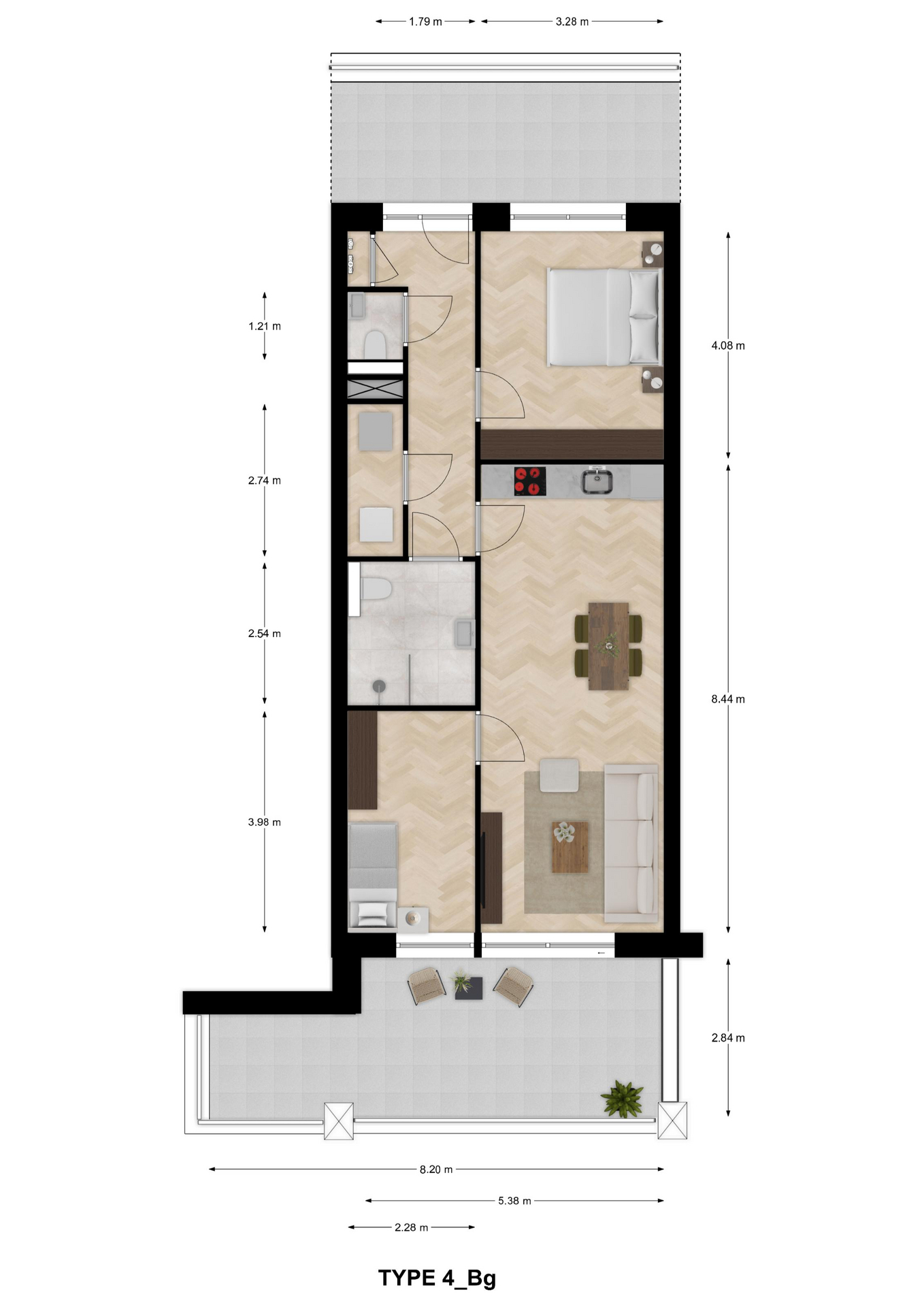 De Type 4 appartementen bevinden zich op de begane grond, eerste en tweede verdieping en vallen direct op door hun slimme indeling en het gevoel van ruimte. Met twee volwaardige slaapkamers is er plek genoeg voor logees, een thuiskantoor of gewoon wat extra rust en privacy.