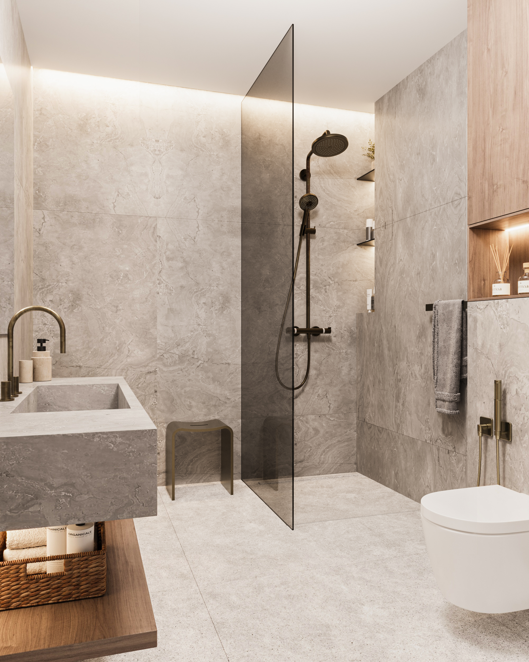 De badkamer vormt een waar rustpunt: modern ingericht, met een royale inloopdouche en een stijlvol afgewerkte uitstraling. Dankzij zowel een apart toilet als een tweede toilet in de badkamer geniet je van optimaal comfort.