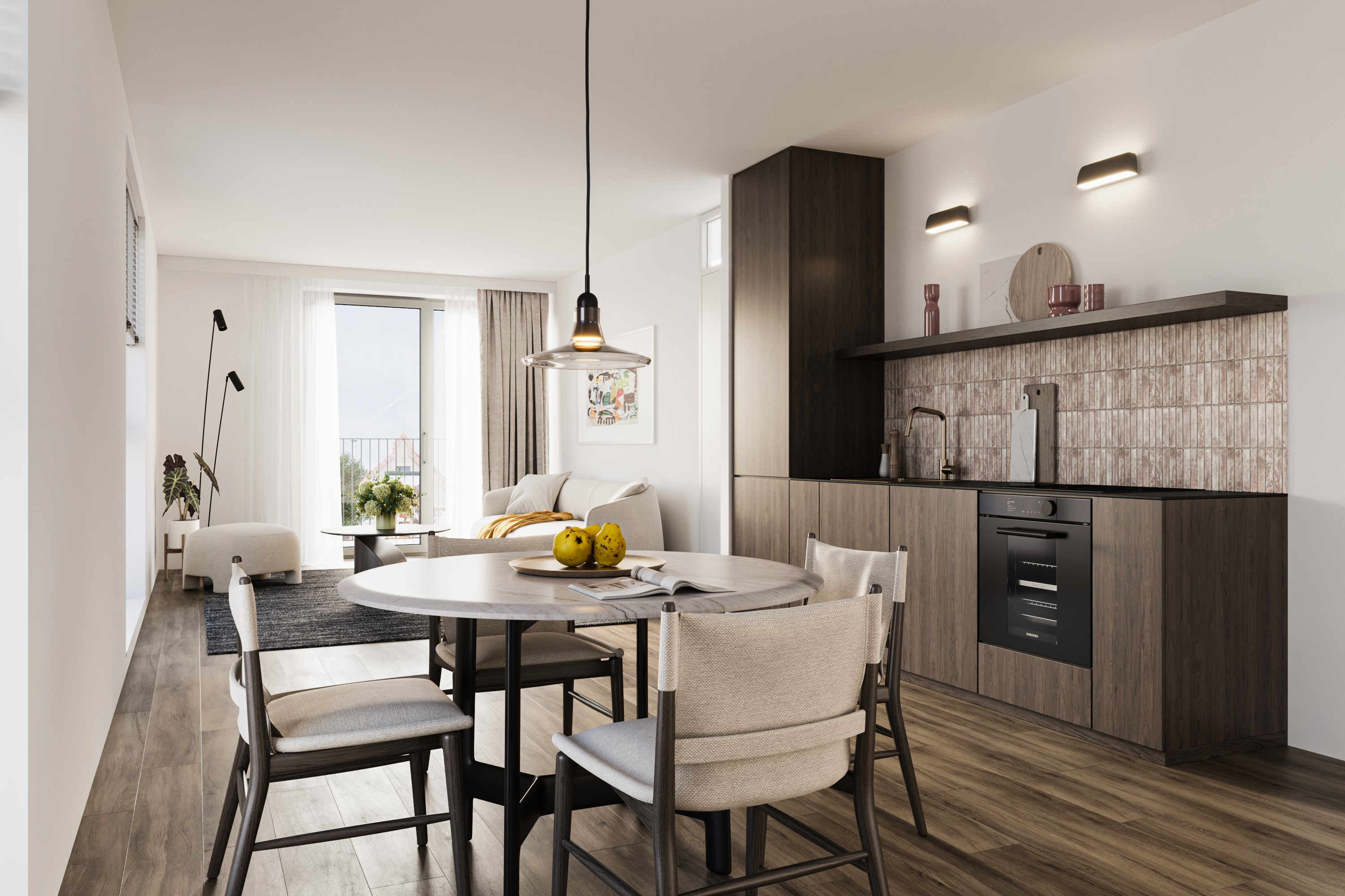De riante woonkamer en de masterbedroom grenzen beide direct aan het balkon of de buitenruimte, waardoor binnen en buiten naadloos in elkaar overlopen. Of je nu de dag begint met de eerste zonnestralen of afsluit met de avondzon — hier geniet je elke dag van je eigen stukje buitenleven.